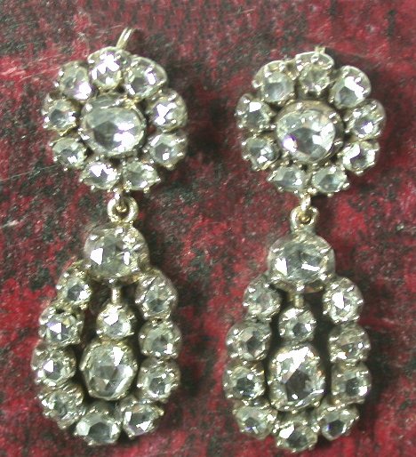 A pair of Georgian gold and rose cut diamond set ear pendants,