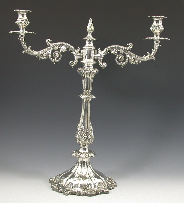 ornate fluted and leaf capped stems on a lobed spread base foliate scroll and floral decoration foliate scrolled branches, removable sconces, central flame finial