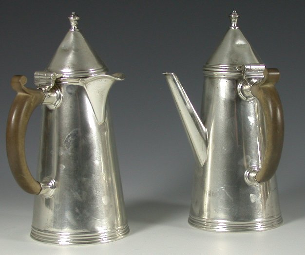 Sheffield 1939, maker's mark of Thomas Bradbury and Sons, of plain tapering form, conical lids, knopped finial, side wooden scroll handles
