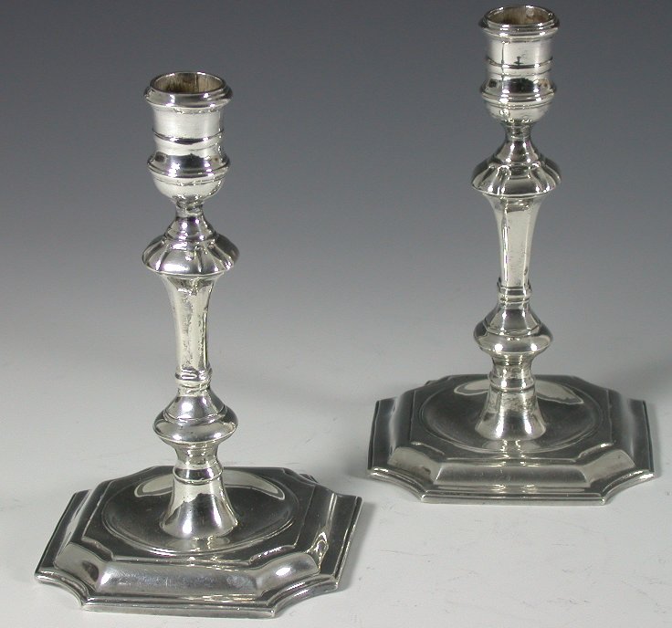 London 1970, maker's mark of JJ, knopped circular stems, each on a moulded square base with incurved corners (2)