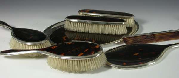 London 1913, maker's mark of William Comyns, comprising: hand mirror, two hairbrushes, 2 clothes brushes, comb and oval tray