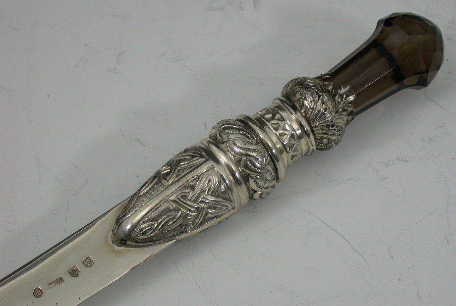 Edinburgh 1903, maker's mark of Young and Tottan, conventional pointed silver blade, the terminal with celtic knot and thistle leaf decoration set with a smokey quartz facetted stone