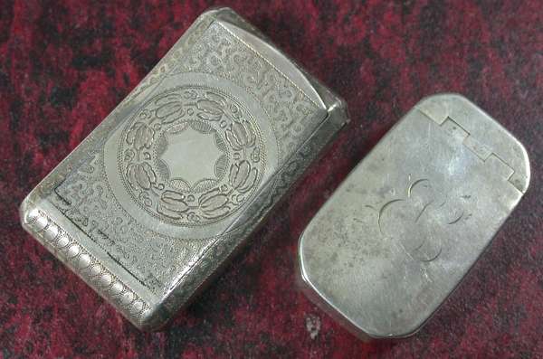 Birmingham 1817, maker's mark of Joseph Taylor, concave rounded rectangular form, wrigglework and stippled goeometric decorated flush hinged lid, gilt intererior, length 5.7 cm, together with A George III snuff box, Birmingham 1805, maker's mark of J.W., of cut-corner rectangular form, flush hinged lid, monogrammed, length 4.7 cm