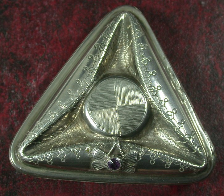 engraved decoration and a thumb piece set with a small amethyst, two marks to the rim