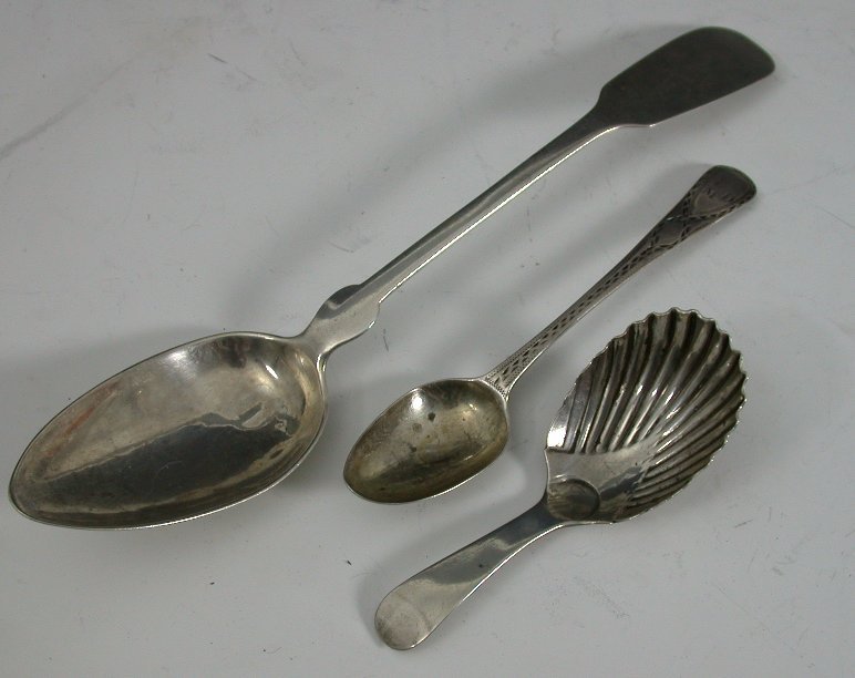 possibly James Wright of Perth, who also worked in Glasgow, shell bowl, and a bright cut teaspoon, R.G., thistle, duty mark, possibly Robert Gray (no town mark) and a Baltic Fiddle pattern table spoon