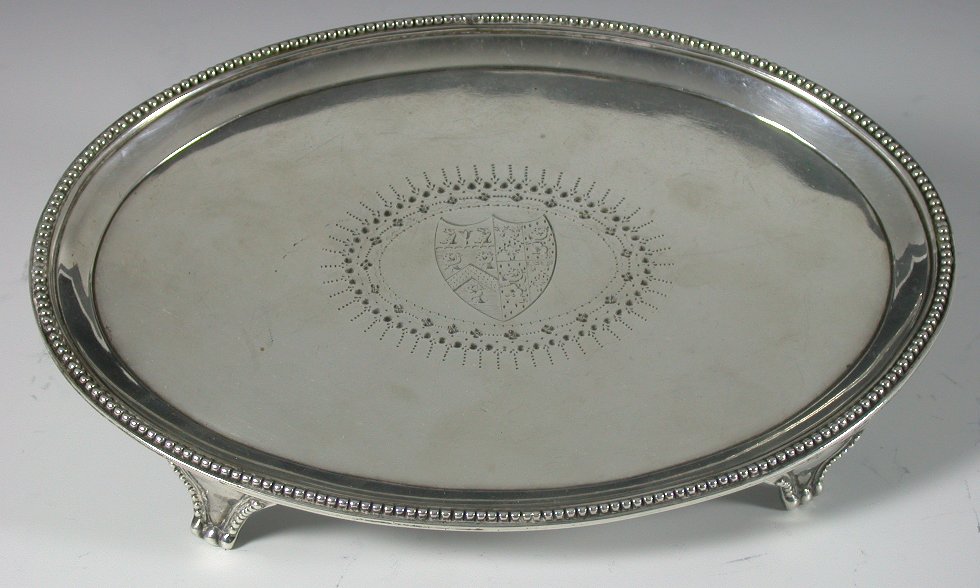 London 1784, maker's mark of Elizabeth Jones, beaded borders, on four bracket feet, engraved oval cartouche with contemporary engraved Armorial