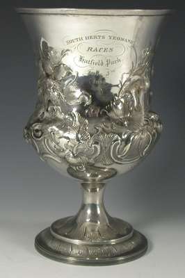London 1805, maker's mark of I.R., of campana form with heavily embossed floral and foliate decoration on a spread circular base, with engraved presentation inscription "SOUTH HERTS YEOMANRY, Races, Hatfield Park, June 3rd 1846