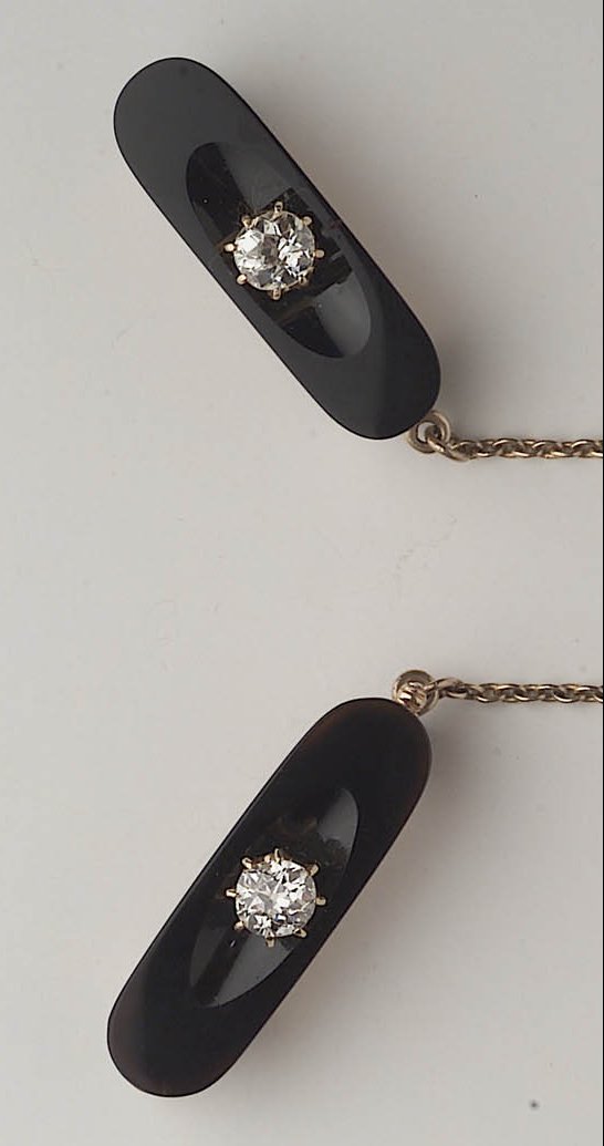 of elongated oval design with connecting chain set in yellow gold.Approximate weight of two diamonds: 3 carats.
