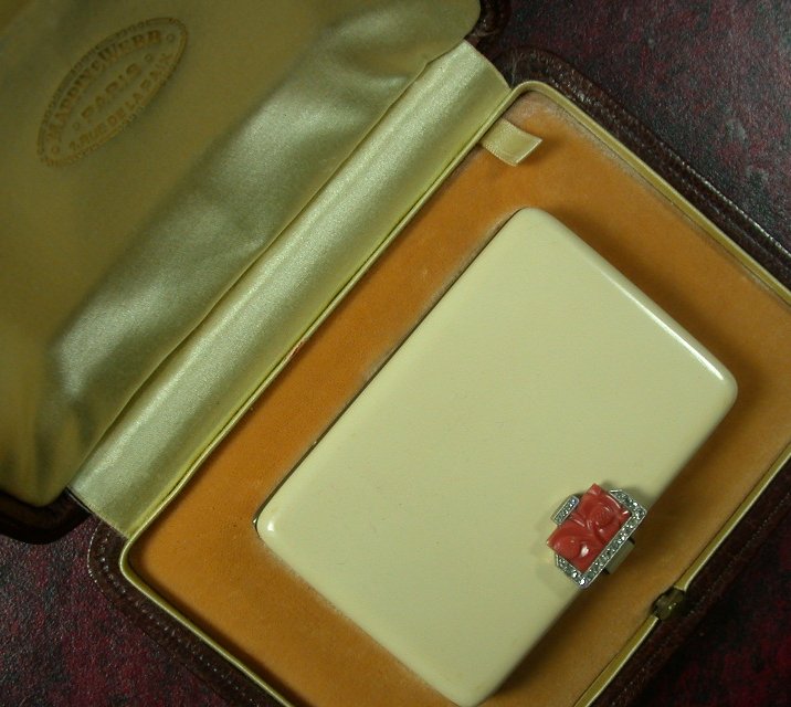 with coral and diamond set clasp, fitted interior, in a fitted case