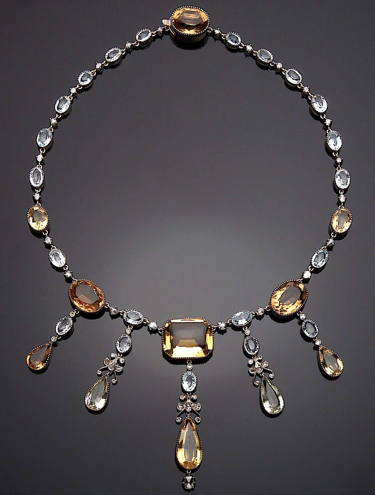 of millegrain set string of oval aquamarines and alternate citrines with central rectangular cut citrine and suspension set with aquamarine, citrines and rose cut diamonds