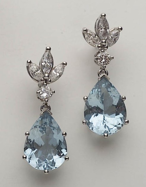 with trefoil diamond marquise tops, set in platinum. Weight of Aquamarines 4.26 carats and Diamonds 0.60 carats