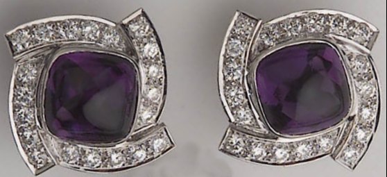 centre set with square cabochon amethysts, with sixteen diamond border on each earring. Approximate weight of diamonds: 3.2 carats.Mounted in 18 ct white gold for Garrard & Co.