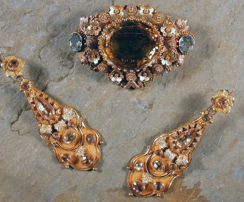 set large facetted citrine with a surround of delicate flowerheads in two colour gold and an oval cut aquamarine to each side; together with two gold drop earrings set citrines and with applied leaf work in a similar style