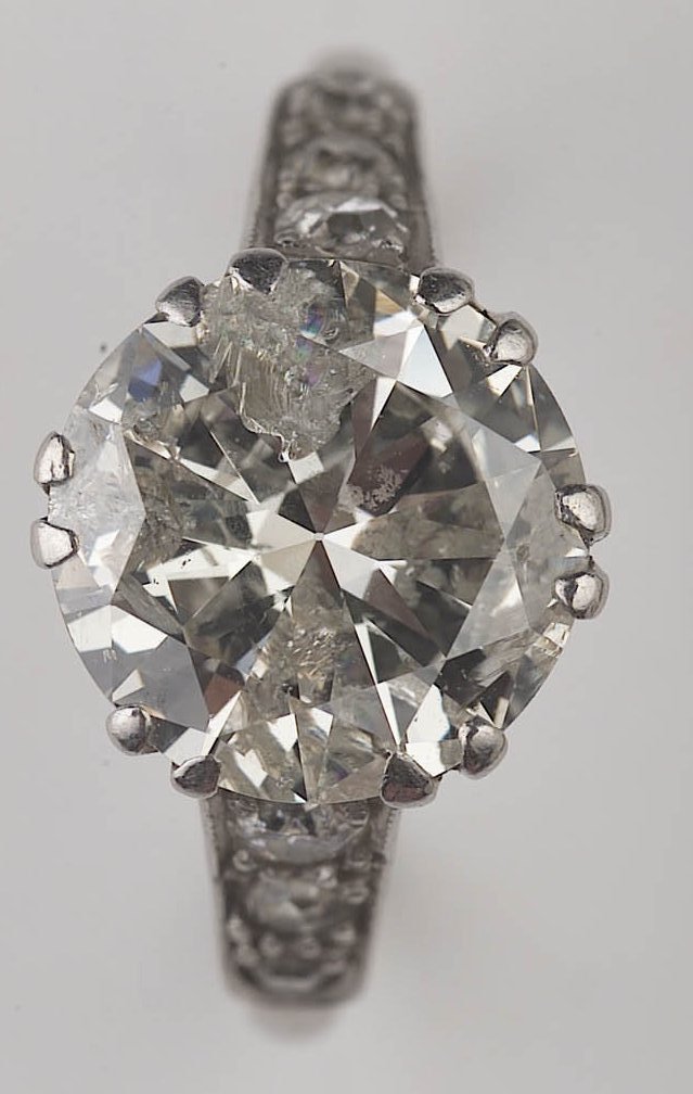 set with diamond shoulders in platinum. Approximate weight of diamond 2.5 carats.