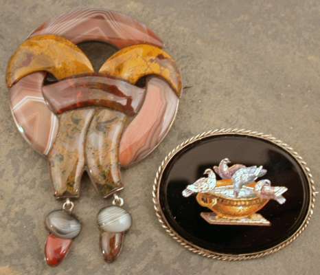 set various polished agates, together with a 19th century Italian micro mosiac brooch depicting Pliny Doves