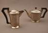 Birmingham 1946, maker's mark of CSG and Co.,of circular form, moulded borders, angular wooden handles, each on a raised circular foot. Together with a late Victorian silver hot water pot, Birmingham 1888, marker's mark of Nathan and Hayes, of baluster form, foilate scroll embossed border on a matted ground, part lobed decoration, domed lobed hinged lid, knopped finial, angular handle, on a raised spread circular foot