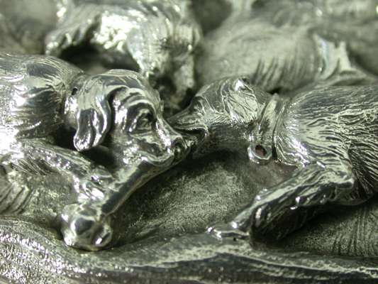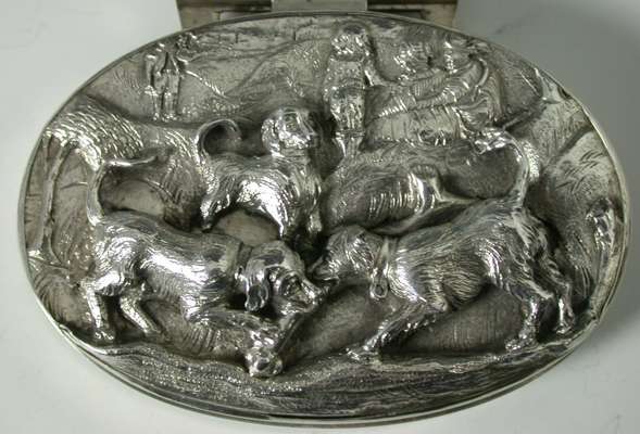 Literature: Delieb, "Silver Boxes", published by Ferndale, London 1979, illustrated pp 41-42, 45. Exhibited: "The Swords and Sorrows", National Trust for Scotland, London 1996 No 7:1 A tentative Opinion from Prof. J. H. Plumb, Vice Master of Christ's College, Canbridge: The son (pun on the 'sun') of Charles 1 (who is clearly the central figure at the top of the box. the fact that he is unclothed shows that he is in heaven (and, of course, a martyr) will return or emerge (as the moon is doing from the eclipse) from the Boscobel Oak (the oak tree with the Welsh mountains behind, which was commonly used as a symbol for Charles II at the time of the Commonwealth) to his kingdom (indicated by the engraved city on the right) or this might read from Breda (I have not seen an engraving of this city, but it might be related to a city with twin spires) and restore the succession (the crown), royal authority (orb), the church (mitre), bring peace (the spectre laid across the sword)restore the coinage (the bits of gold on the table), and hang (the halter) his enemies. And the rest of the story is told on the chased (inner lid). There is the picture of a peaceful and plentiful countryside and obviously the dogs are gnawing the bones of the king's enemies. The fact of the guineas on the table, suggests, I think, that the box can be dated just after 1696 when the re-coinage by the government of William III created great difficulty for most people and brought about a chronic shortage of cash. Also I think that this emblematic description of restoration of the Stuarts is cast in an historic form so that it could not be regarded as treasonable. It could be argued that it only depicted what had happened in 1660, although the implication, of course is clear enough: what happened once might happen again.