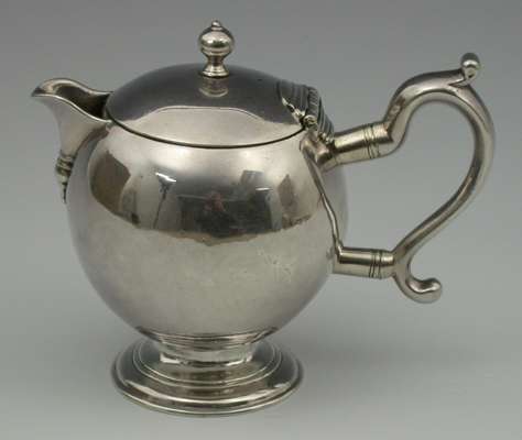 with marks for Edinburgh 1729, maker James Ker, Assaymaster Edward Penman, the spherical body with V shaped spout, orb finial, scroll handle