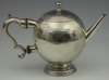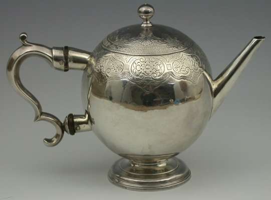 with marks for Edinburgh 1729, maker John Main, Assaymaster Archibald Ure, the spherical body with a straight tapering spout, chased band of scrolls, shells and flowers, orb finial, scroll handle