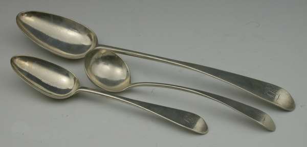 with marks for Dundee circa 1780, maker William Scott, of Old English pattern, pointed end, engraved initials "JF" in script comprising: four gravy spoons, four sauce ladles with unusually long stems, five tablespoons and another similar, five dessert spoons, five teaspoons, two saltspoons, four marks, WS, pot of lilies, WS, W
