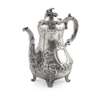 The Barnards, London 1856, of baluster form, the lower body with heavily embossed and chased floral decoration, vacant cartouche to either side, the C-scroll handle with leaf clasped decoration and ivory insulators, the hinged lid with floral finial, raised on four cast foliate feet