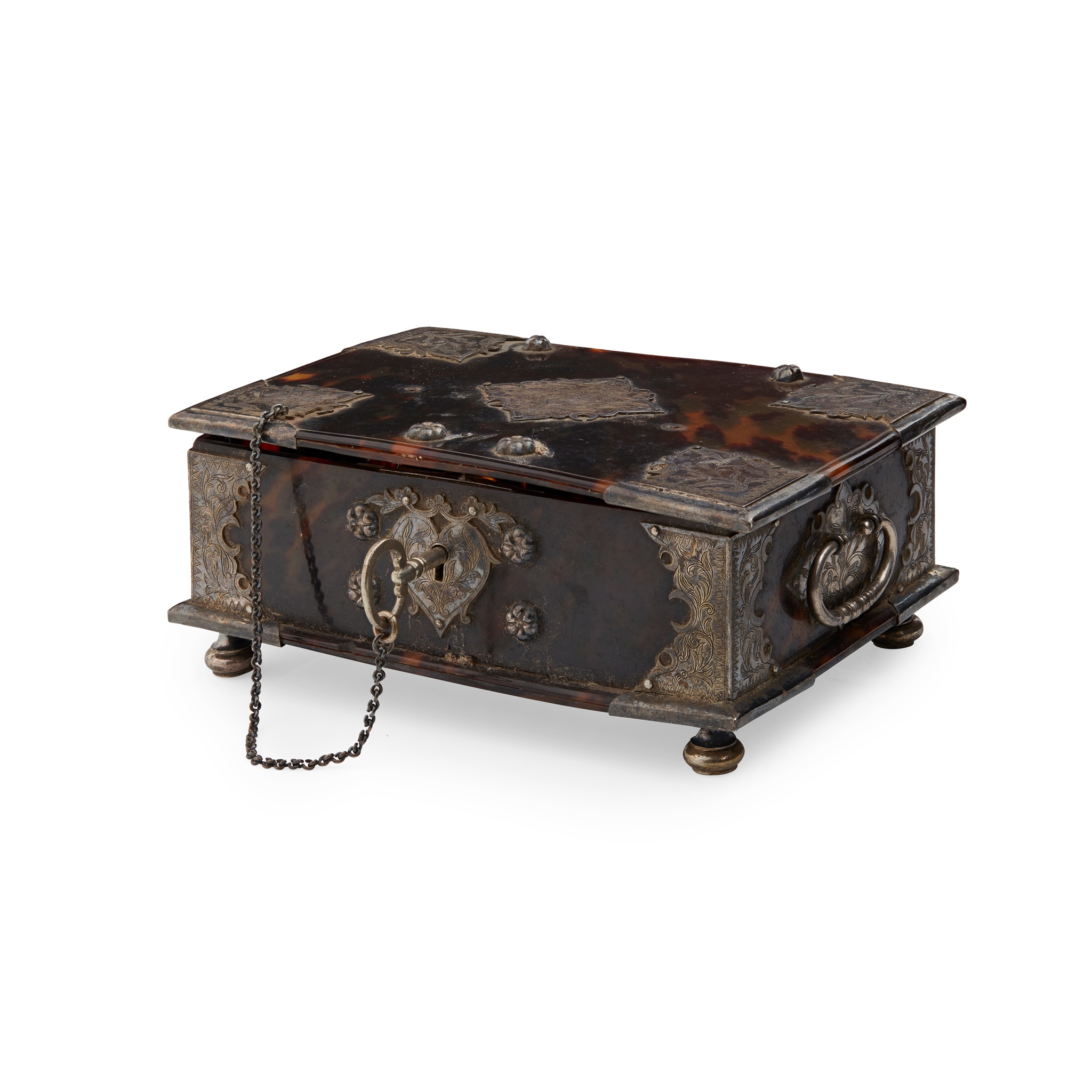 unmarked, of rectangular form, hinged lid, with key and chain attached, the top and sides all with silver mounts, well engraved stylised foliage, silver reeded bosses and escutcheon, all on silver disc feet, with loop handles cast detail, the interior with shaped long hinges
