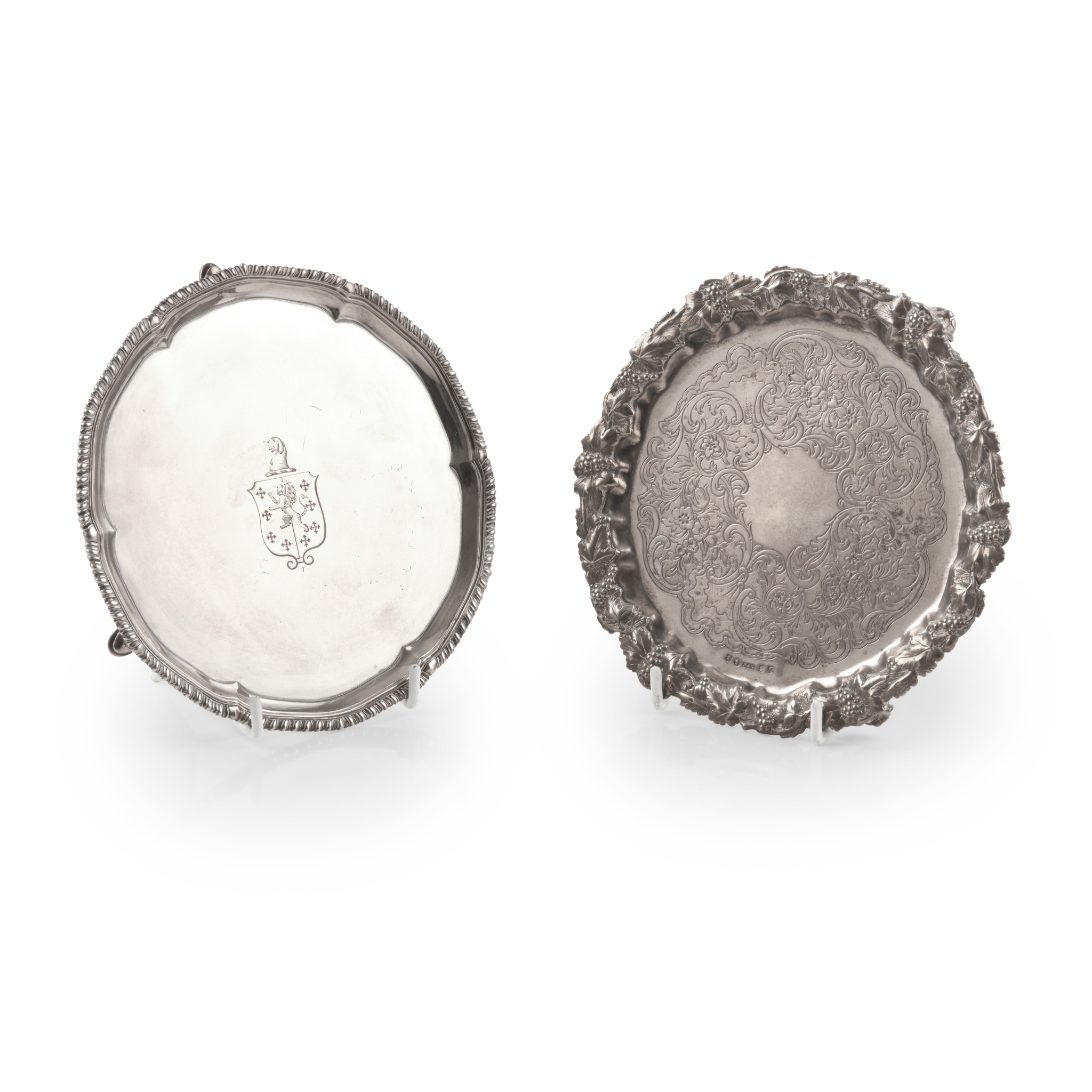 Robert Jones, London 1782, of circular outline with gadrooned border, later engraved armorial to centre, raised on three hoof feet; together with another, R&G, Glasgow 1852, with cast vine border, engraved scroll and floral decoration to centre, raised on three bracket cast feet