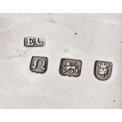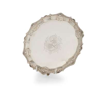 Ebenezer Coker, London 1768, of moulded circular outline with cast gadrooned and shell border, armorial engraved to centre, raised on three ball and claw feet; together with another, John Swift, London 1763, with gadrooned border and engraved floral detail to the flat, later engraved armorials to centre, raised on three hoof feet