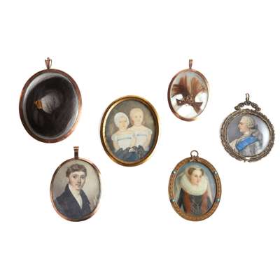 within an oval brass and turquoise decorated frame, and loop bale; together with a circular miniature of The Young Pretender, Charles Edward 1721-1788, cast brass frame, English School; an early 19th-century, half bust portrait of a gentleman, English School; late 18th-century; two children in white dresses, blue ribbon, watercolour on card, French School; and two miniature frames with plaited hair, one on a mother of pearl ground, some painted on ivory