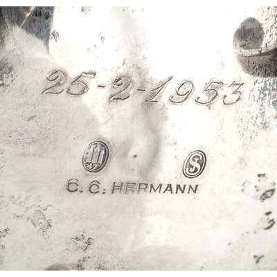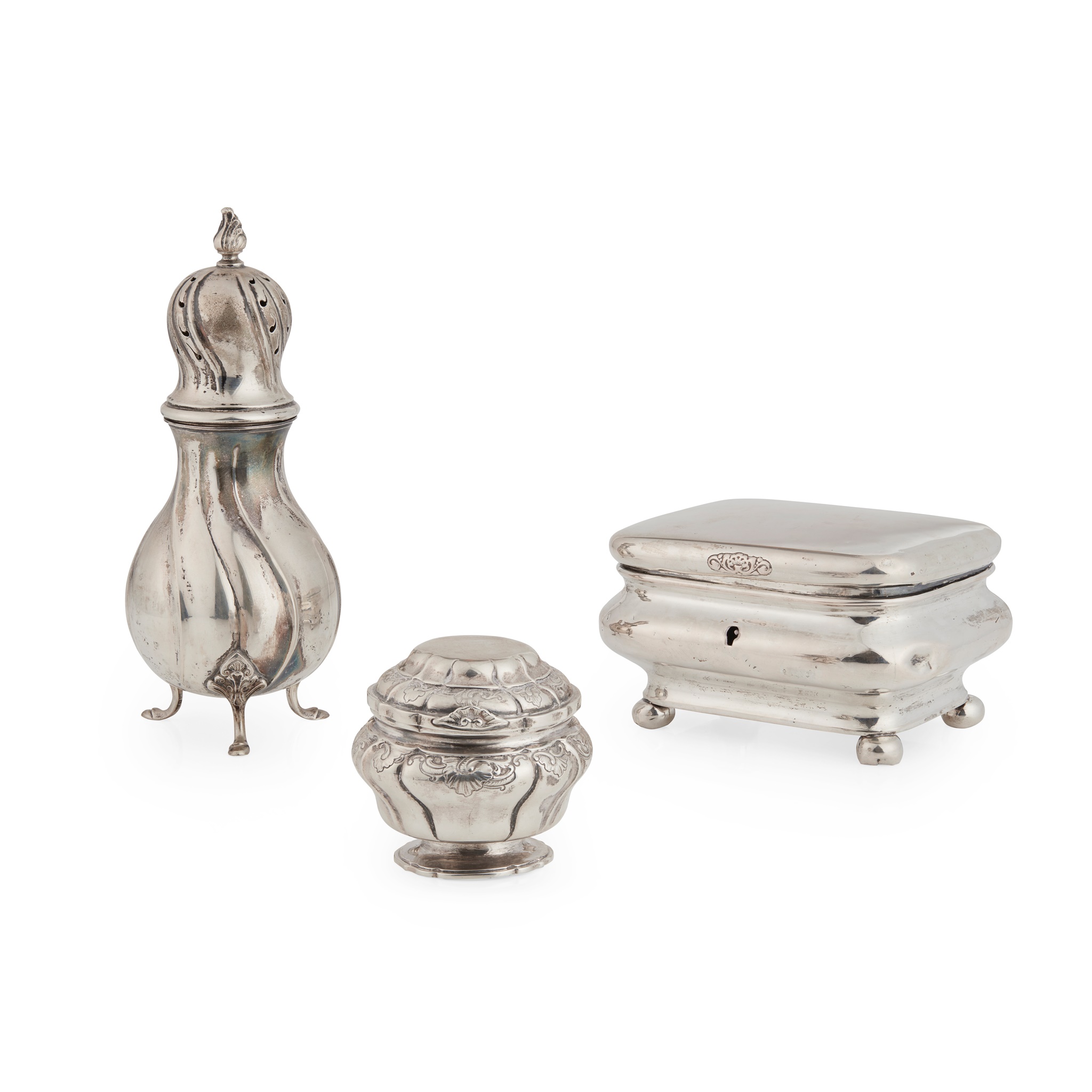 Anton Michelsen, Assay Master, C.F. Heise, of squat globular baluster fluted form, with chased floral and shell decoration, raised on a moulded circular foot; together with a Danish caster, C.C.Hermann, of baluster form with fluted detail, the pierced pull-off lid with floral flame finial and a large trinket box of bombé form, unmarked, raised on four ball feet