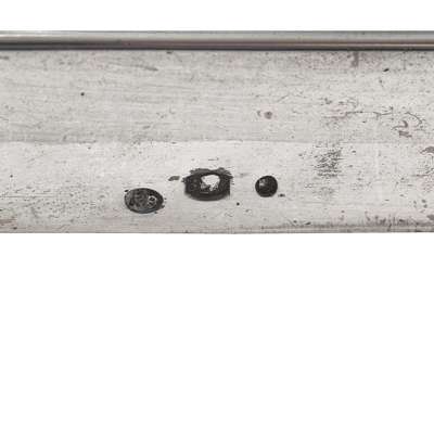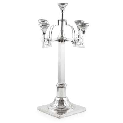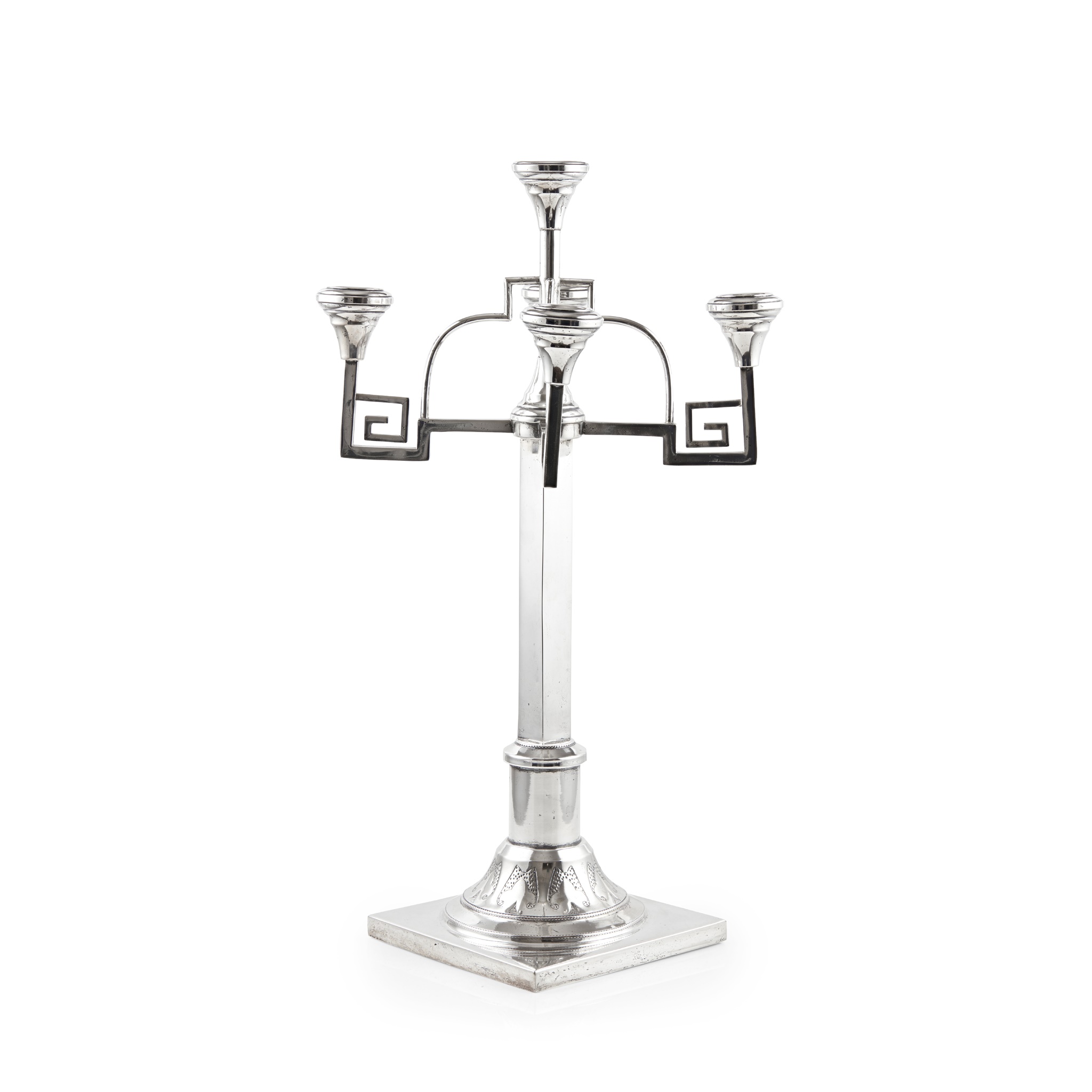 indistinctly marked to base, the central square column above a flared square base, with low relief chased motifs, the geometric arms with Greek-key detail and arched supports, simple sconces
