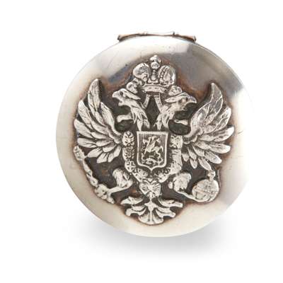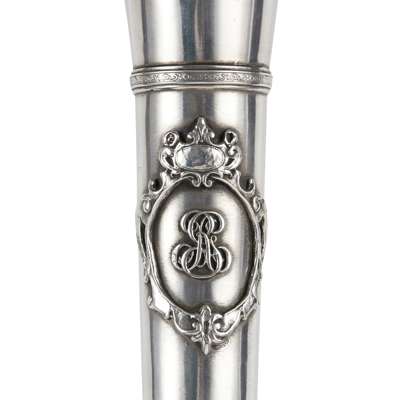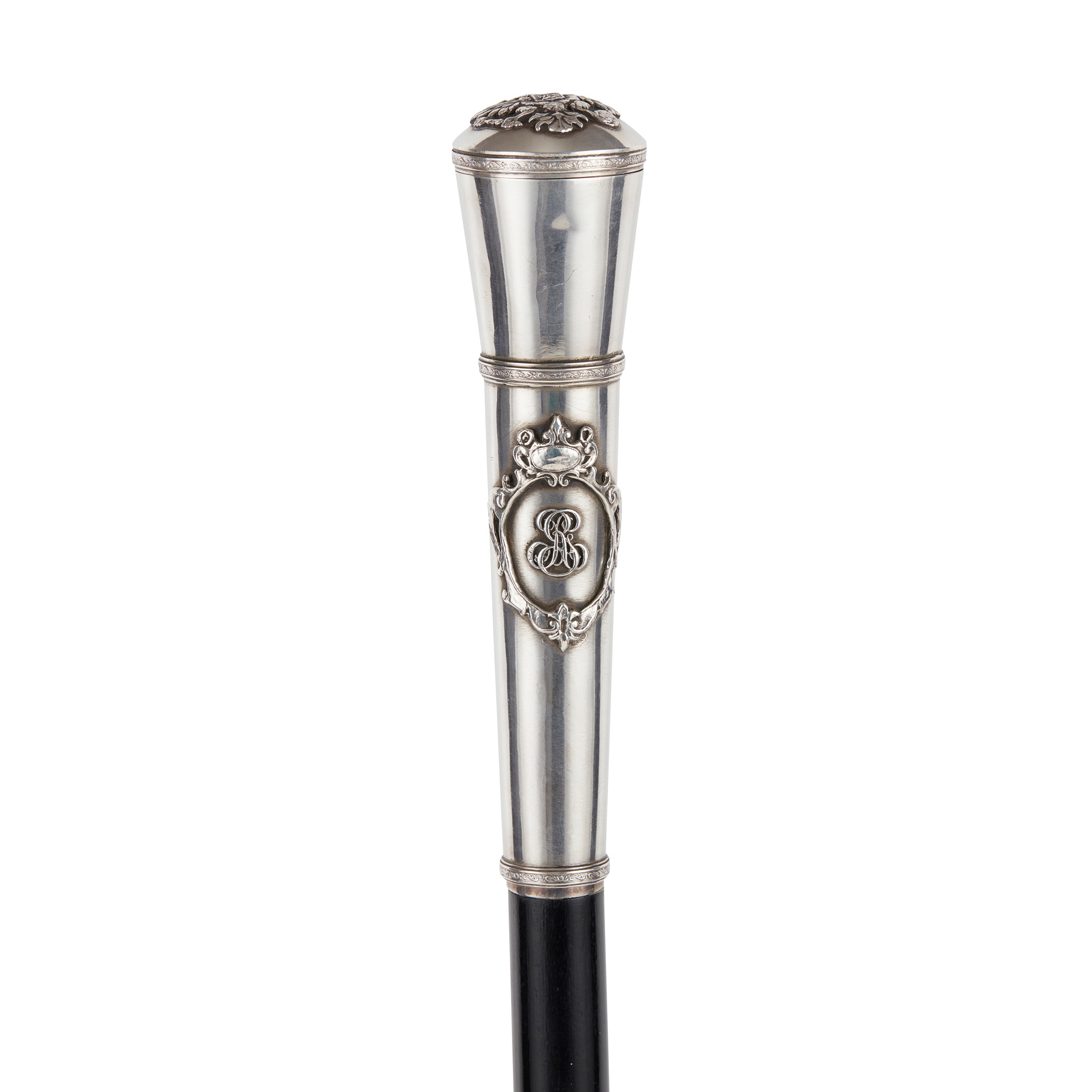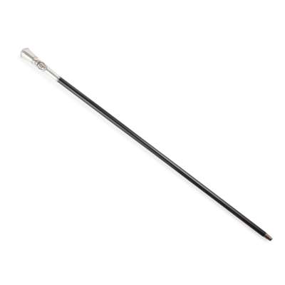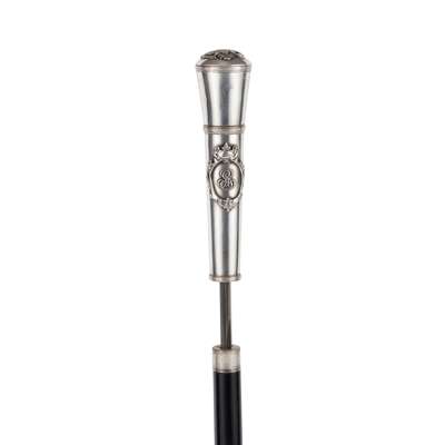 1896, of tapered ebonised form, the silver-mounted handle with applied monogram, the hinged lid with applied Imperial Eagle, snuff compartment to lid, the whole handle pulling away to reveal a tapered stiletto blade