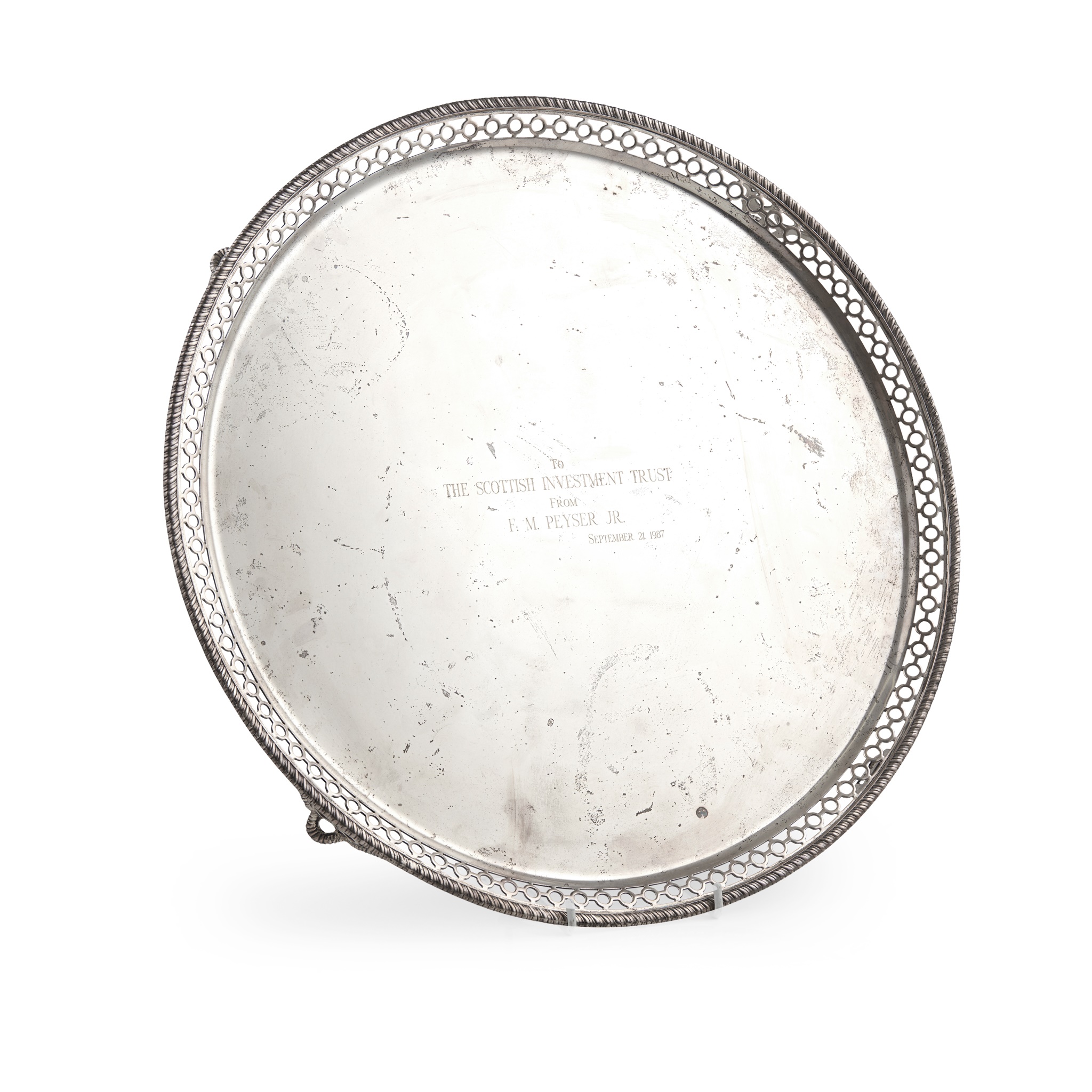 stamped HOWARD & CO, STERLING, NEW YORK, 1903, of circular outline, engraved to the centre TO/ THE SCOTTISH INVESTMENT TRUST/ FROM/ F.M. PEYSER. JR/ SEPTEMBER 1987, pierced and gadrooned rim, to four pierced bracket feet