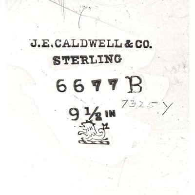J.E. CALDWELL & Co./ STERLING/ 6677B, of oval outline, with pierced borders, circular motifs with cornucopia motifs, the swing-handle with a pierced foliate design and engraved LEJ to centre of handle, oval base