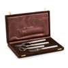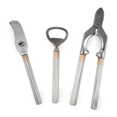 comprising, champagne tongs, bottle opener, and a serrated fruit knife, each stem of ribbed cylindrical form, with a rose gold coloured band, stamped BVLGARI, 925 to each terminal, presented in a fitted velvet case
