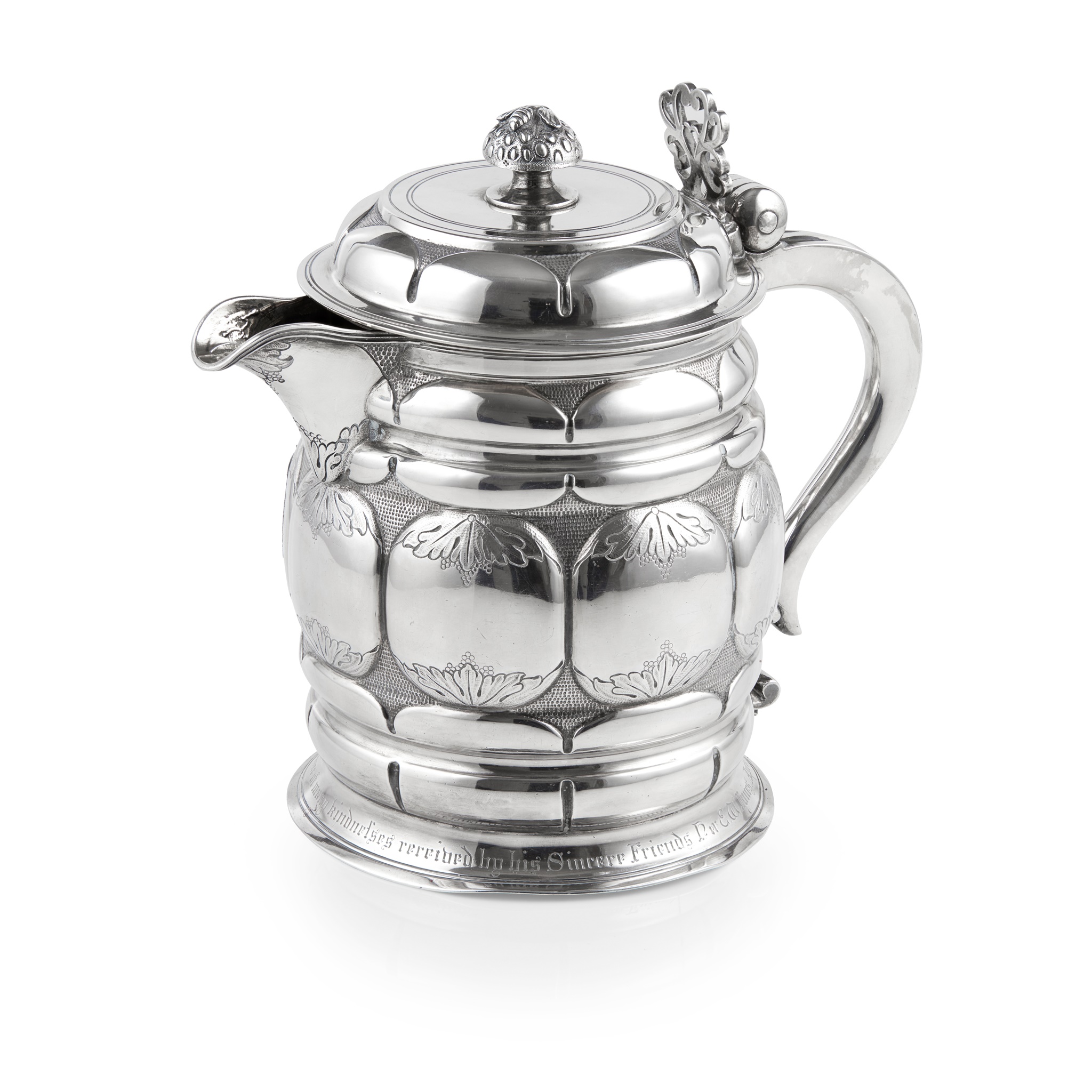 London Assay Office, London 2022, with cancelled marks for John Parker I & Edward Wakelin 1775, later converted to a jug, embossed panelled body and the lid with added finial, engraved presentation inscription around the foot rim and dated 1857