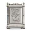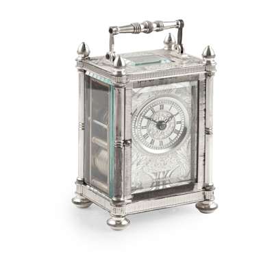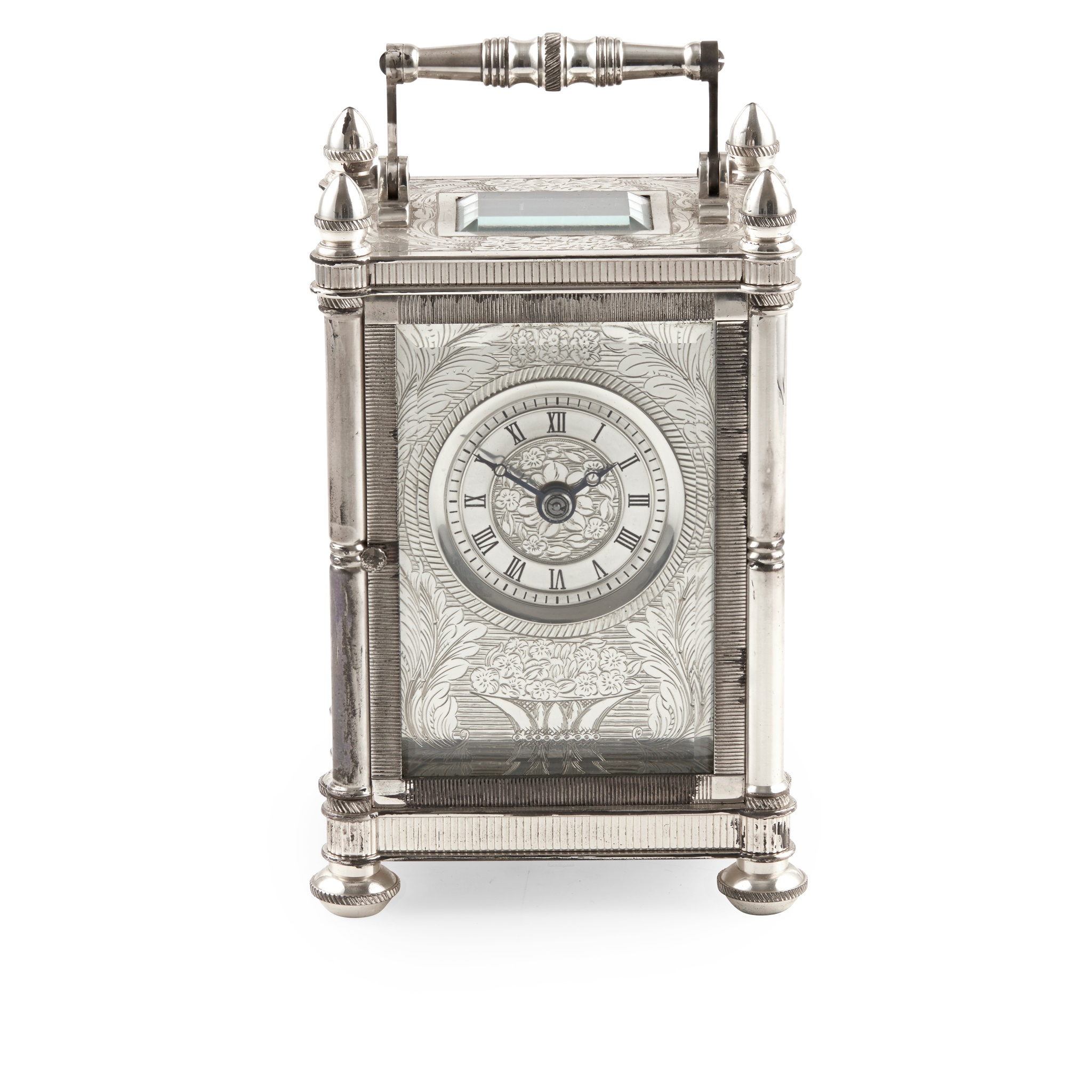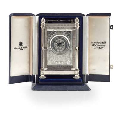 Mappin & Webb, London 1975, of traditional form, the heavy case with acorn finials, all over ribbed decoration, glazed panels, the silver dial with Roman numerals to the chapter ring and engraved basket of flowers etc., turned disc feet, the movement of 8 day English twin fusee, visible escapement, all in a fitted case with key and certificate no. 126 of 200