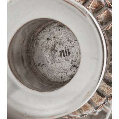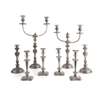 plate on copper, comprising four table candlesticks and a pair of three-light candelabra branches to match, leaf clasped baluster stems and shaped bases similar decoration; together with another set of four plated table candlesticks