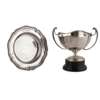 Ollivant & Botsford, London 1921, the hemi-spherical bowl with undulating rim, presentation engraving to body for 'BOWDON GOLF CLUB/ CAPTAIN'S PRIZE/ 1923...'. with leaf clasped handles, raised on a spreading stem to a circular foot, with plinth; together with a plated dinner plate, with gadrooned border and engraved armorials to rim