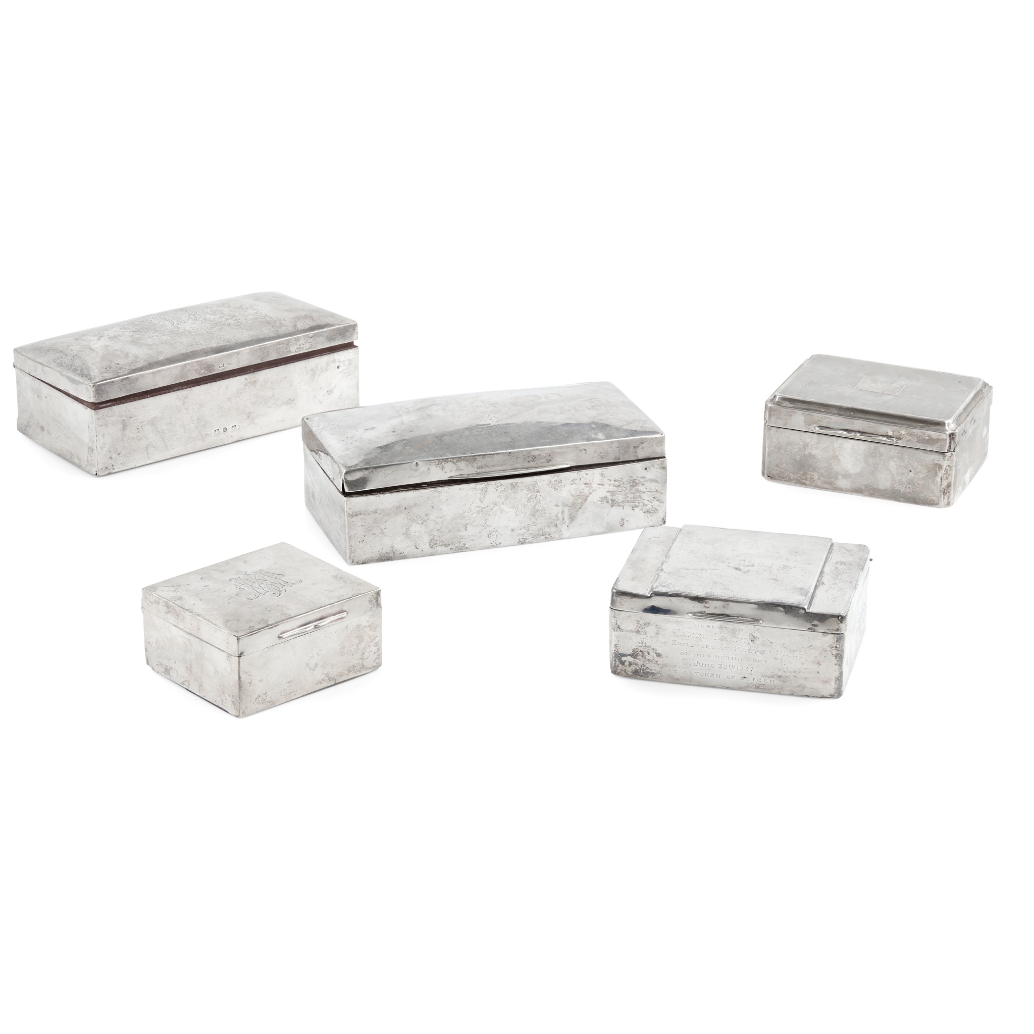 various makers and dates, three with engraved monograms to the hinged lids, two with engine turned decoration to the lids, one of which with a presentation engraving to the body