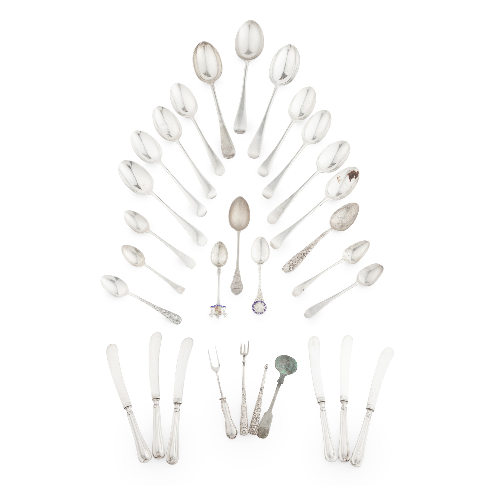 mainly London and Sheffield, various makers and dates, comprising three tablespoons and eight dessert spoons; together with a collection of teaspoons including plated, fruit knives, pickle forks etc.