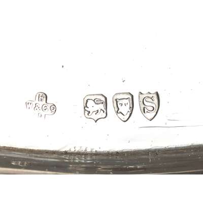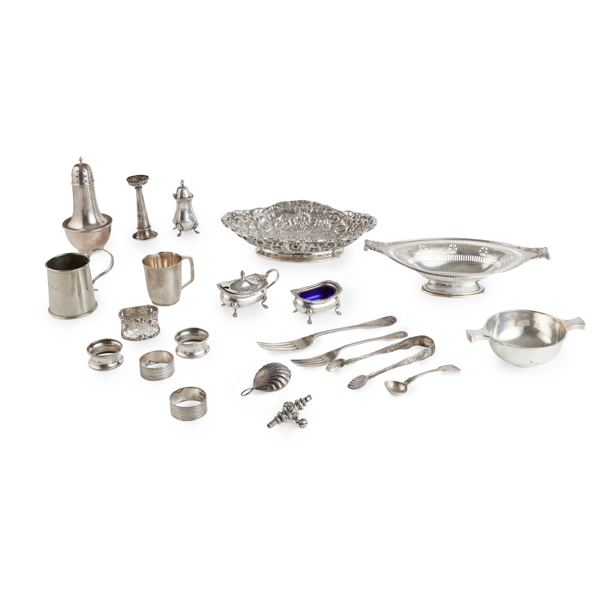 Thomas Bradbury & Sons Ltd, Sheffield 1910, of oval outline, pierced border with Adam-style engraved decoration, cast scroll acanthus handles, raised on an oval foot with similar pierced detail; together with another basket, Horace Woodward & Co Ltd, London 1893, with chased floral decoration throughout; an Indian colonial mug, J Hamilton & Co. Calcutta, marked BS, JH, & Co. Fleur di lys; a modern quaich, Brook & Sons, Edinburgh; a modern caster and a collection of condiments, napkin rings, flatware, rattle head, etc.