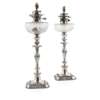 Martin and Hunt, Sheffield 1907, with bold facetted glass fonts, full paraffin wick fittings and electric bulb socket, the tall columns of bold leaf clasped form, onto a large rounded square base with shell and foliate detail, one with engraved inscription relating to 'The Officer's Mess, Donegal ESAM, by Captain J Workman 1902'