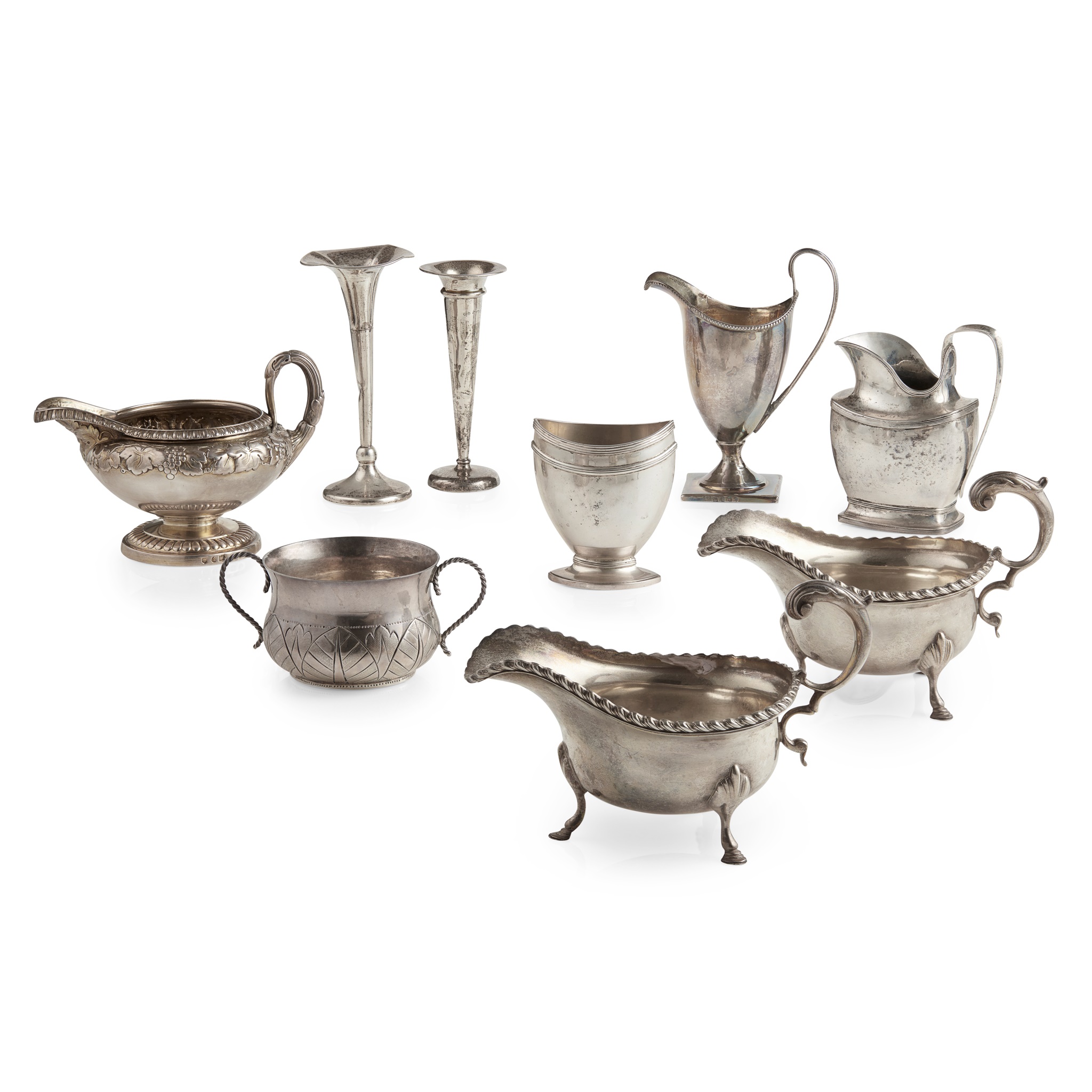 Robert Grey, Glasgow 1820, in the Regency style with embossed vine border; together with a pair of sauce boats, S Blanckensee & Son Ltd Birmingham 1930 with a gadrooned border; and a collection to include spill vases, twin-handled 17th-Century style porringer, George III cream helmet, a French 19th-Century cream jug and sugar bowl