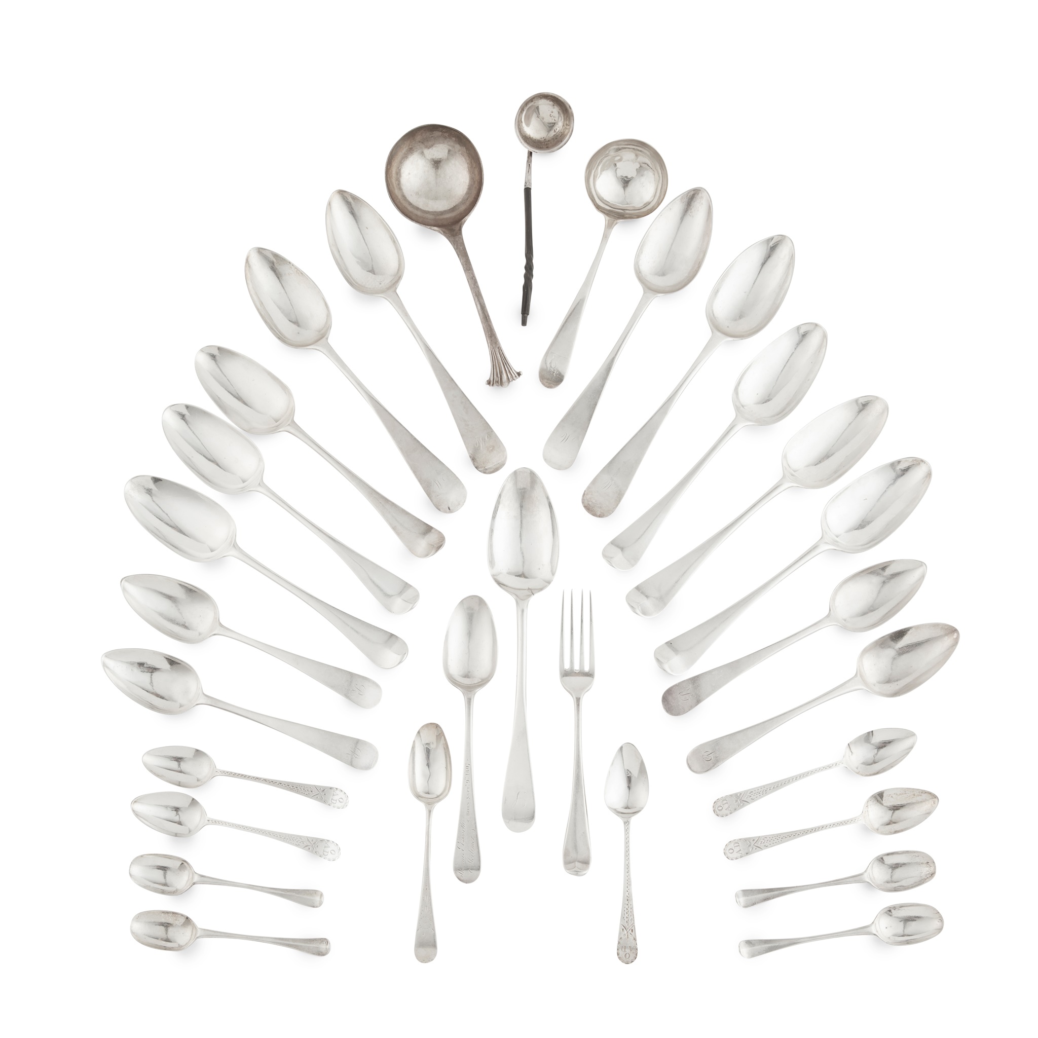 Charles Jamieson, marked CJ, INS, camel, *, of Old English pattern, with initials engraved to the terminal; together with a set of three Glasgow provincial tablespoons, Milne & Campbell, with initials engraved to terminal and another Edinburgh example; together with a matched set of six George II tablespoons of Hanoverian pattern; with various other flatware including punch ladles, teaspoons, dessert spoons and a fork