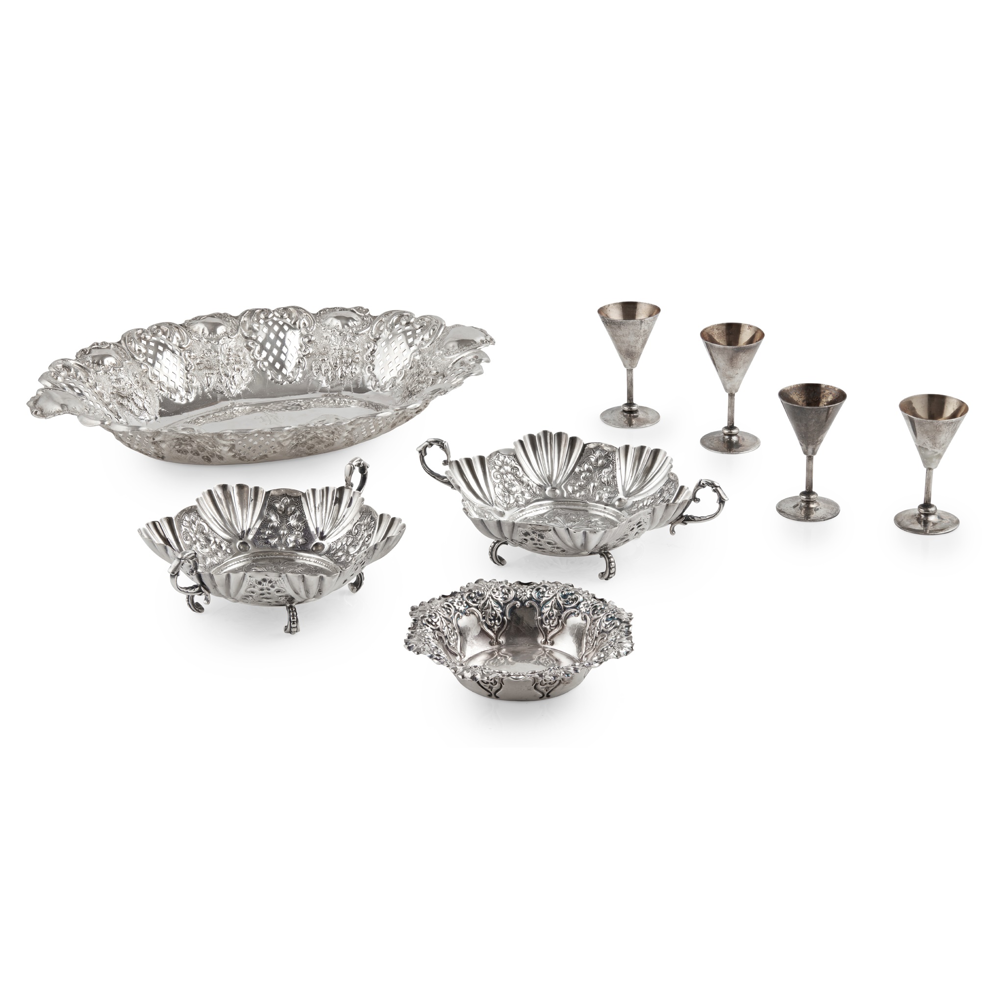 Birmingham 1903, of oval outline, with chased foliate detail and pierced work, engraved monogram; together with a pair of Continental late 19th-Century twin-handled squat bowls, of lobed form, foliate repoussé decoration and fan panels; a sweetmeat basket and four Edwardian liqueur glasses, London 1905