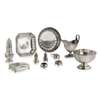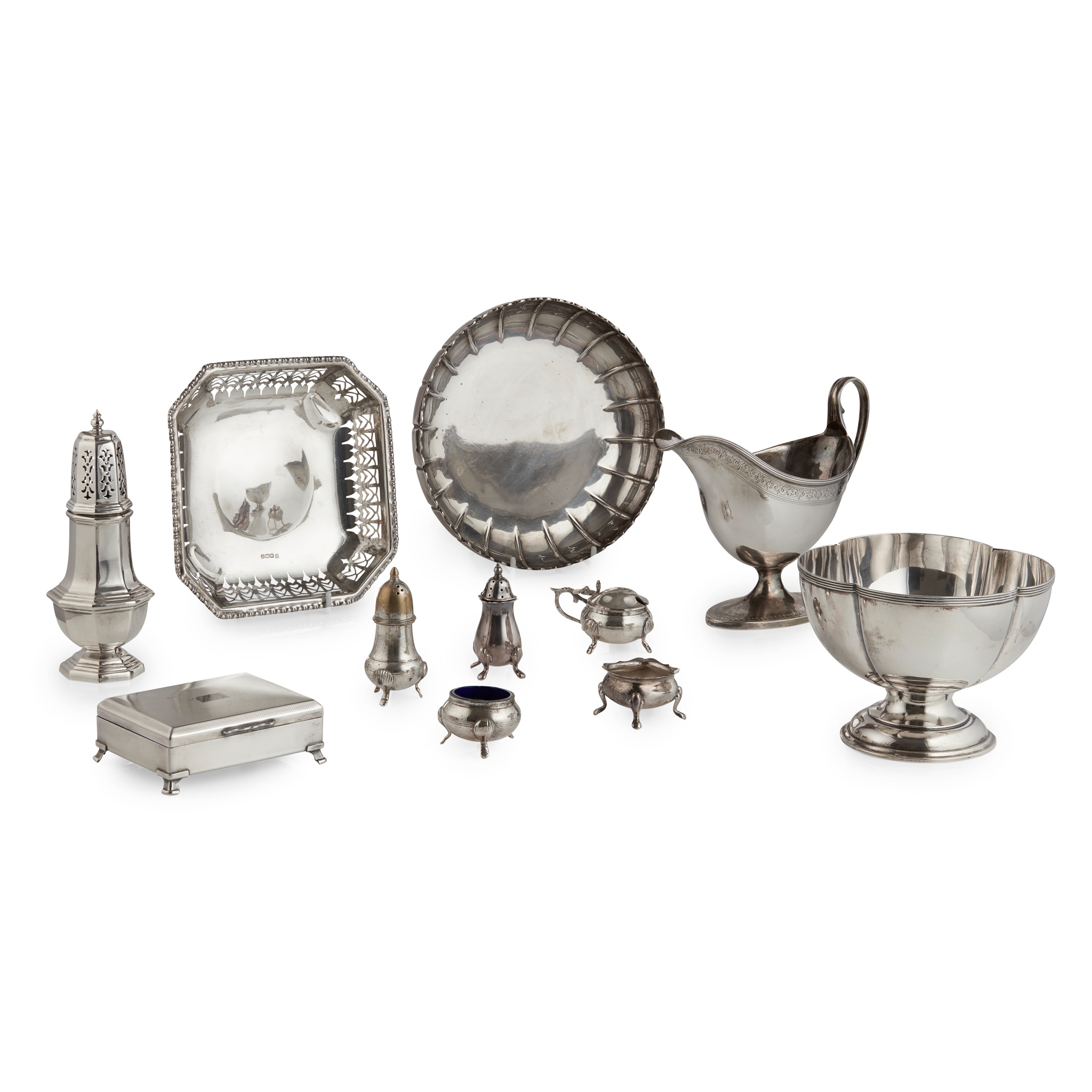 London 1899, with scalloped rim; together with a lobed bowl, Alexander Clark & Co Ltd, Birmingham 1912, with threaded border; a sauceboat, London Assay Office, 1946, with bright-cut engraving; a 1970s octagonal caster; together with a pierced dish, Sheffield 1932, of square outline with canted edges, raised on four cast scroll feet; a plated cigarette box and a collection of plated condiments
