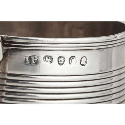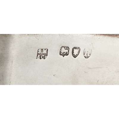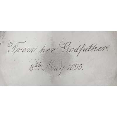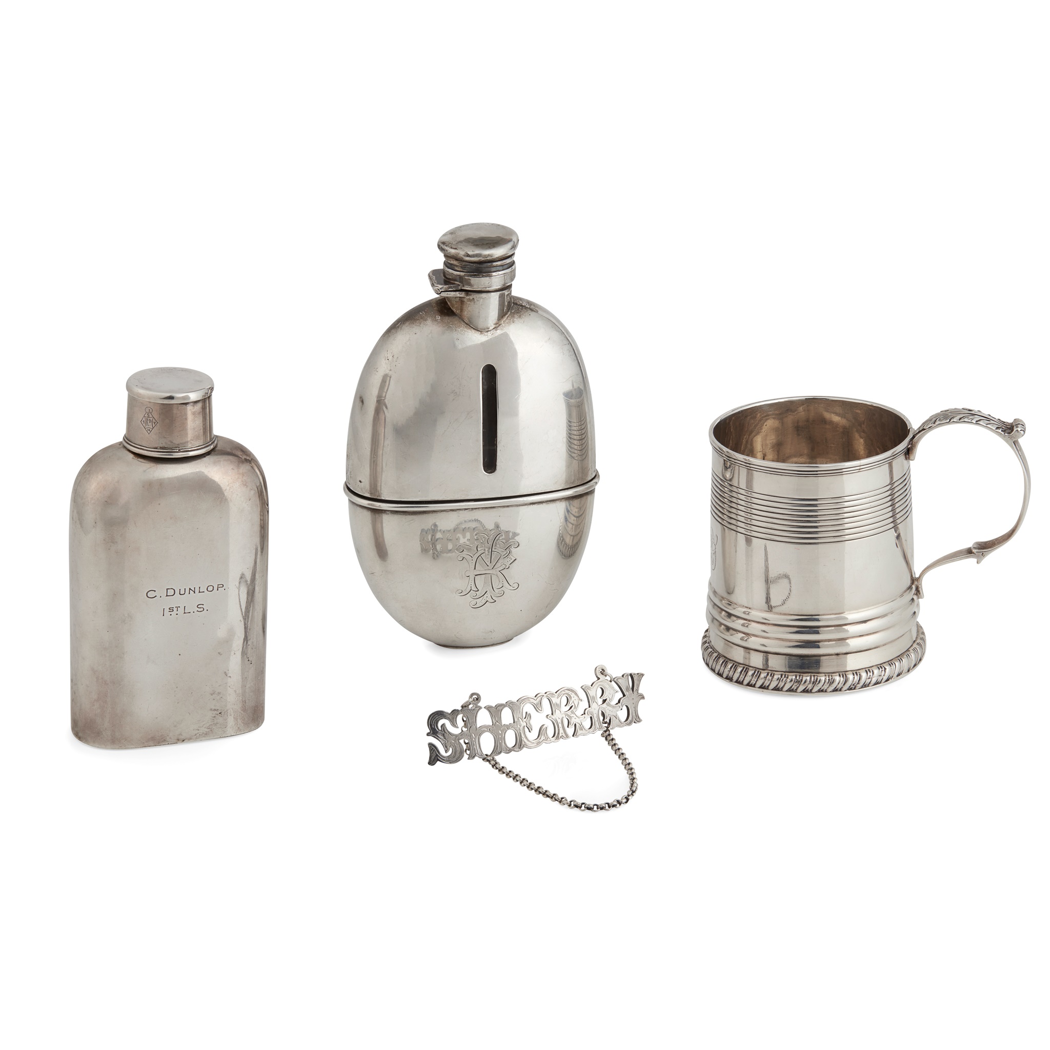 Sampson Mordan & Co, London 1892, of curved oval form, the pull-off cup with gilt interior and engraved monogram to centre, with a hinged lid, glass liner; with another smaller flask, London 1879, of rectangular form, screw-off expandable cup lid, engraved to body C. DUNLOP/ 1ST. L.S.; together with a George III mug, with later presentation engraving dated 1895 to the underside and an unmarked SHERRY wine label