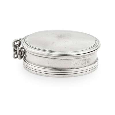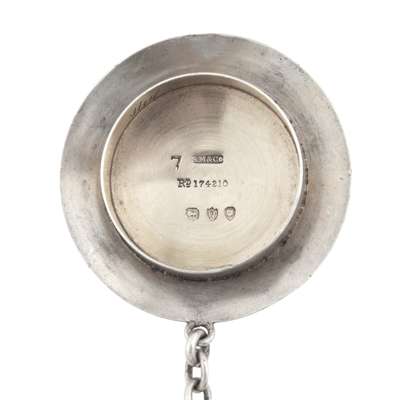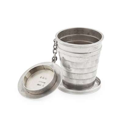 Sampson Mordan & Co, London 1891, the circular disc with chain link, opens to a collapsable tapered cup, with gilt interior