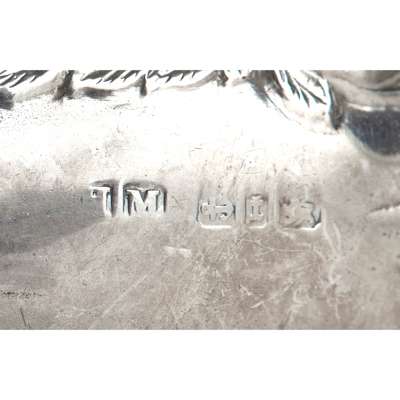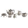 London 1890, comprising teapot, twin handled sugar basin and milk jug, all of pear form, with embossed panels with hunting scenes and scroll decoration, naturalistically formed handles, undulating rim, the hinged lid with a domed finial; together with a George IV salt, London 1825, of oval outline, embossed floral decoration, raised on four shell feet; a George II milk jug, London circa 1740, of baluster form and a modern condiment